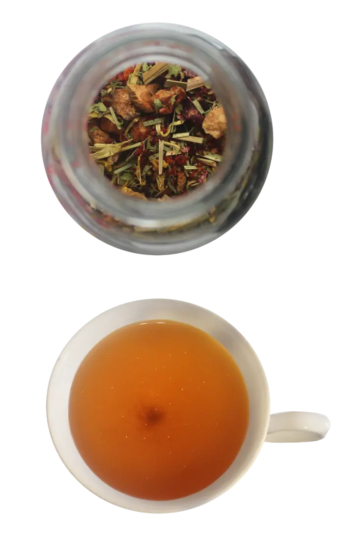 Pomme, Hibiscus, Citronnelle, Rooibos naturel, Menthe, Raisin (Raisin, Huile végétale), Cynorrhodon, Arôme naturel de pêche, Fleurs de souci, Arôme naturel de citron, Pétales de rose, Pêche, Piment de Cayenne concassé sans graines, Paillettes blanches comestibles (Mica(E555) Silicon Dioxide(E551),Iron Oxide(E172),Ag(E174))