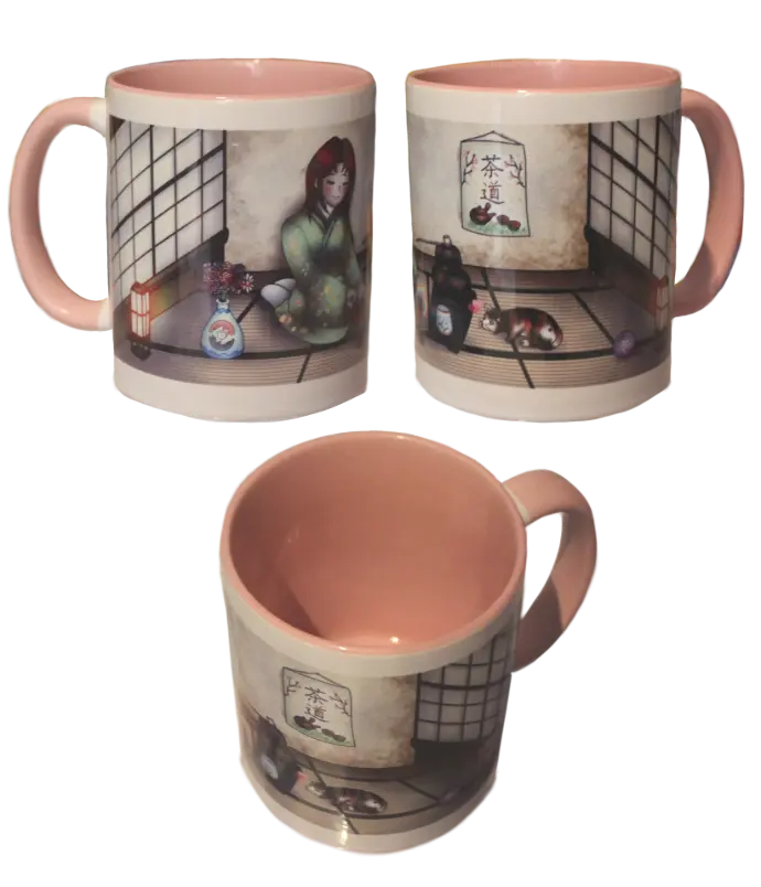 Ce mug blanc aux teintes rosées permet de contenir votre boisson préférée ! L'illustration a été faite pour la convention Japan Touch 2025 !