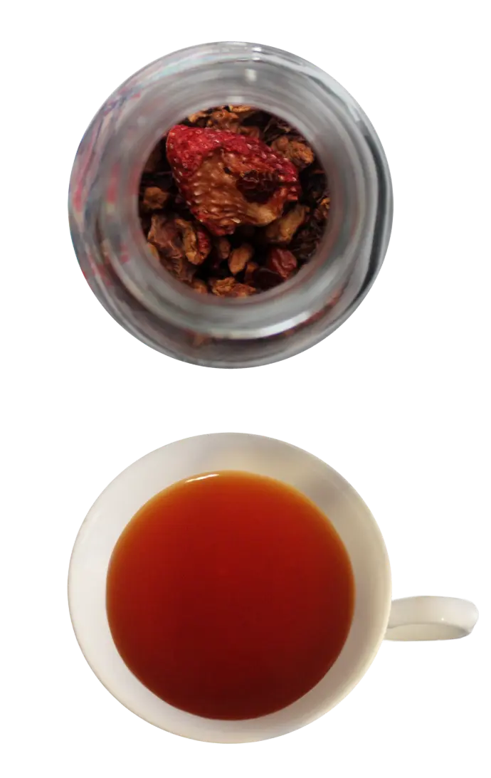 Si vous voulez profiter d'une boisson à la fraise et à la vanille à n'importe quel moment de la journée, profitez du Rooibos "Soirée aux fraises", l'équivalent sans théine de notre thé noir "Jardin aux fraises" !