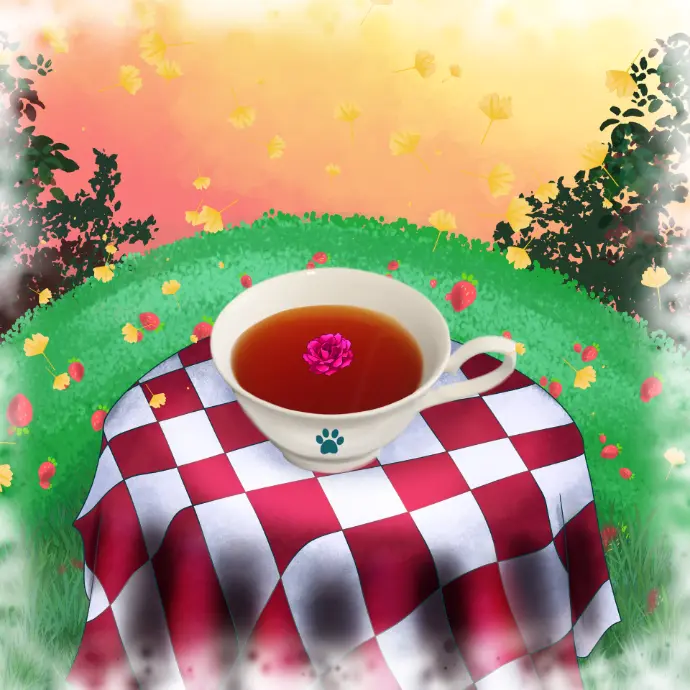 "Rocket s'était tellement amusé dans le jardin à l'odeur de de fraises qu'il s'était à nouveau perdu ! Le temps passe et le crépuscule commençait... C'est à ce moment là qu'il découvrit une autre partie du jardin, un peu plus boisée... Mais toujours aussi fruitée !"