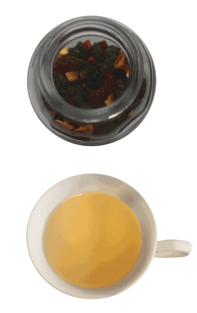 Thé Milky Oolong (Chine), Pomme, Raisin (raisin, huile végétale), Cynorrhodon, Écorces d'orange, Coing, Bâtons de cannelle, Arômes, Morceaux de citron, Vanille